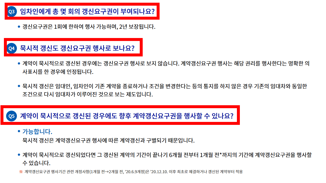 - 묵시적 갱신과 구별: 계약갱신청구권은 임차인이 ‘청구’해야 효력이 발생, 자동 연장은 해당 없음