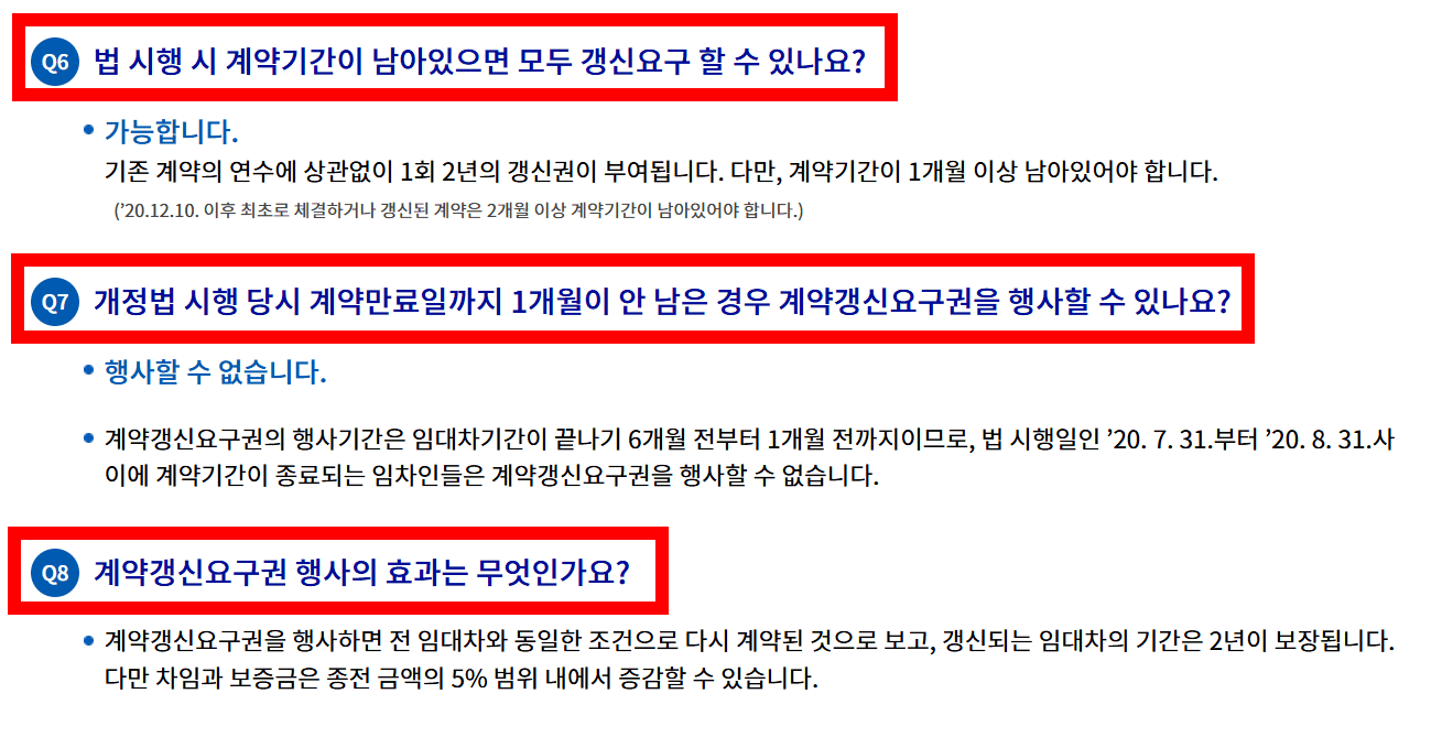 - 법 시행일(2020.7.31.)~2020.8.31. 사이에 계약이 만료되는 임차인은 갱신청구권을 행사할 수 없습니다.
