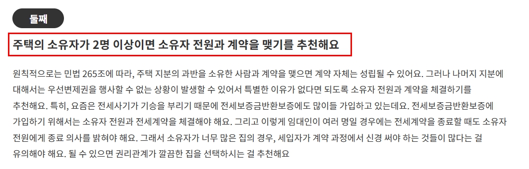 또한 공동명의일 경우에는 모든 소유자의 동의가 필요하기 때문에 일부만 계약할 경우 문제가 발생할 수 있습니다.