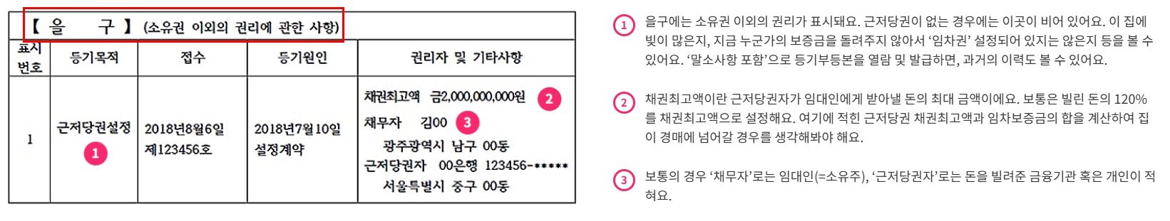 을구는 금전과 관련된 권리 관계가 기록되는 부분으로, 가장 주의 깊게 확인해야 합니다.