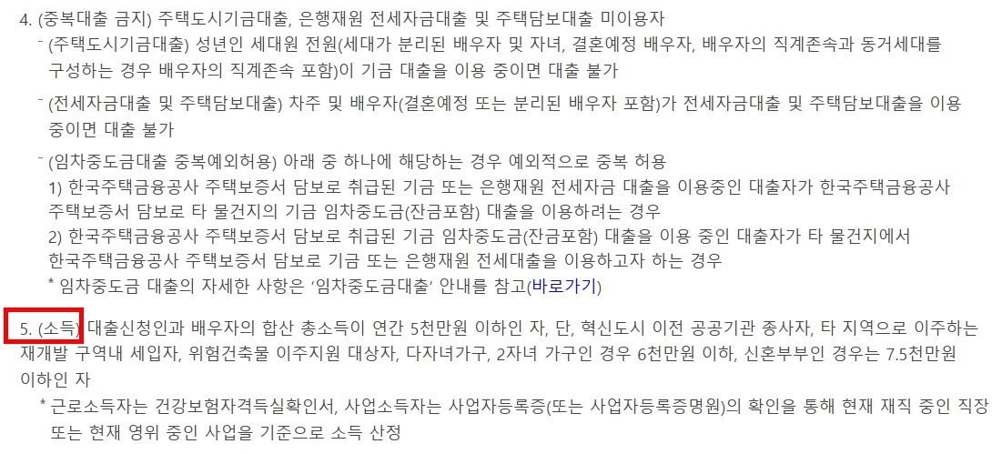 - 청년(단독 세대주) : 약 5천만 원 이하