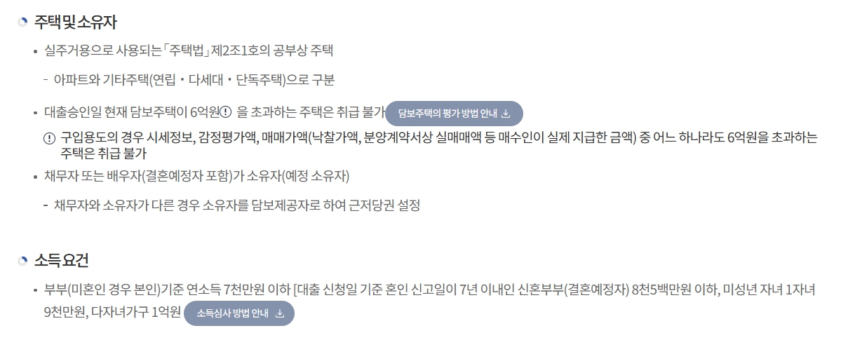 - 주택 가격 및 면적 기준은 대출 상품별로 상이함