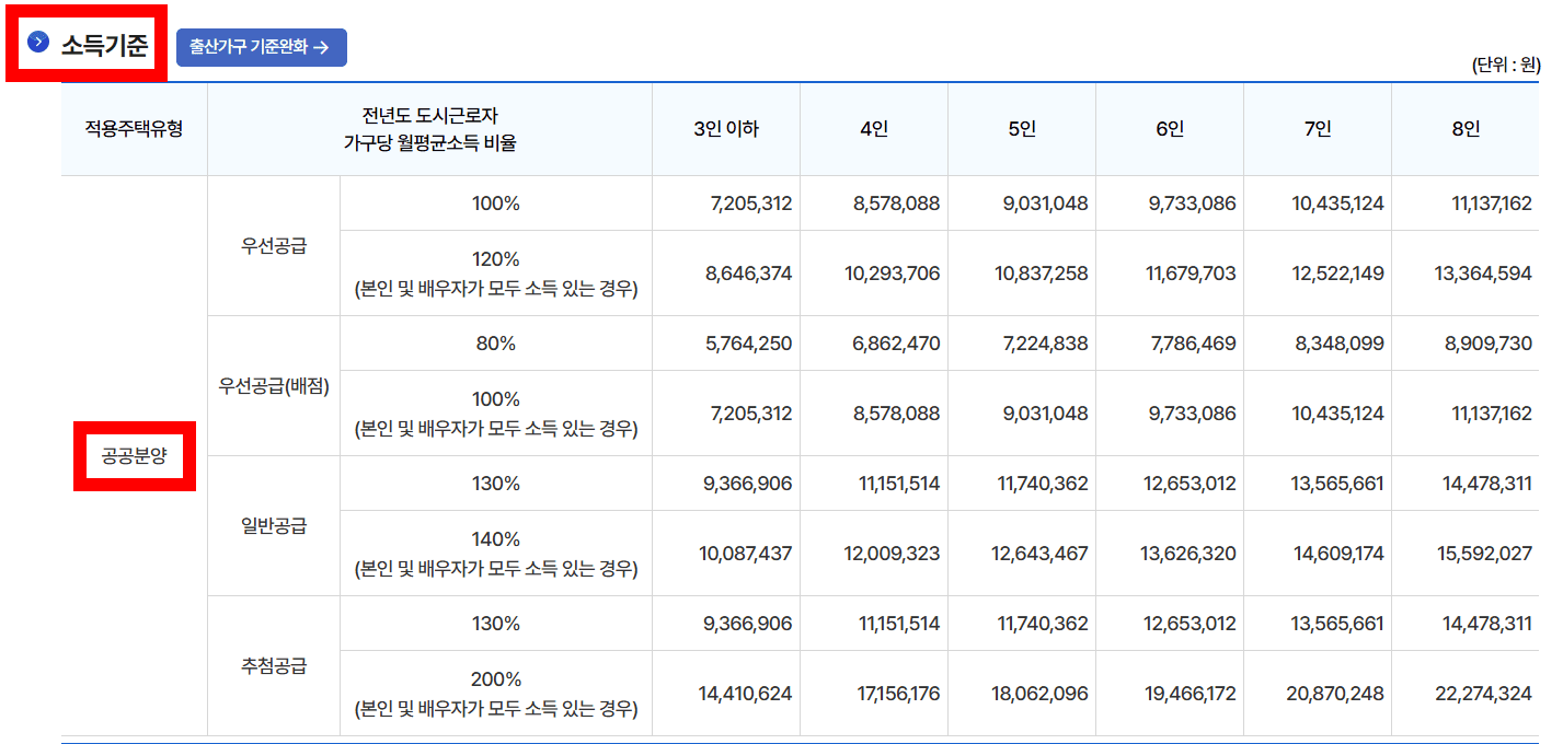 | 소득 기준 | 공공주택: 도시근로자 월평균 소득 140% 이하(맞벌이 200% 이하)로 완화 |