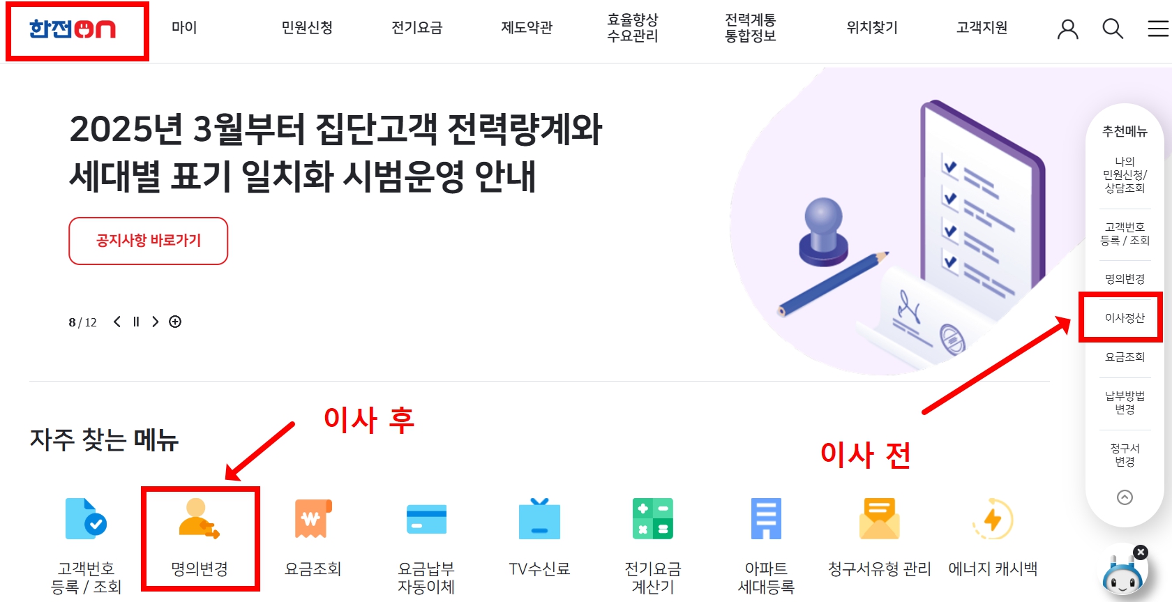 - 전기요금: 이사 당일 한국전력공사 고객센터(☎123)에 계량기 지침을 전달해 정산합니다. 한전 사이버지점 또는 모바일 앱에서도 처리 가능합니다.