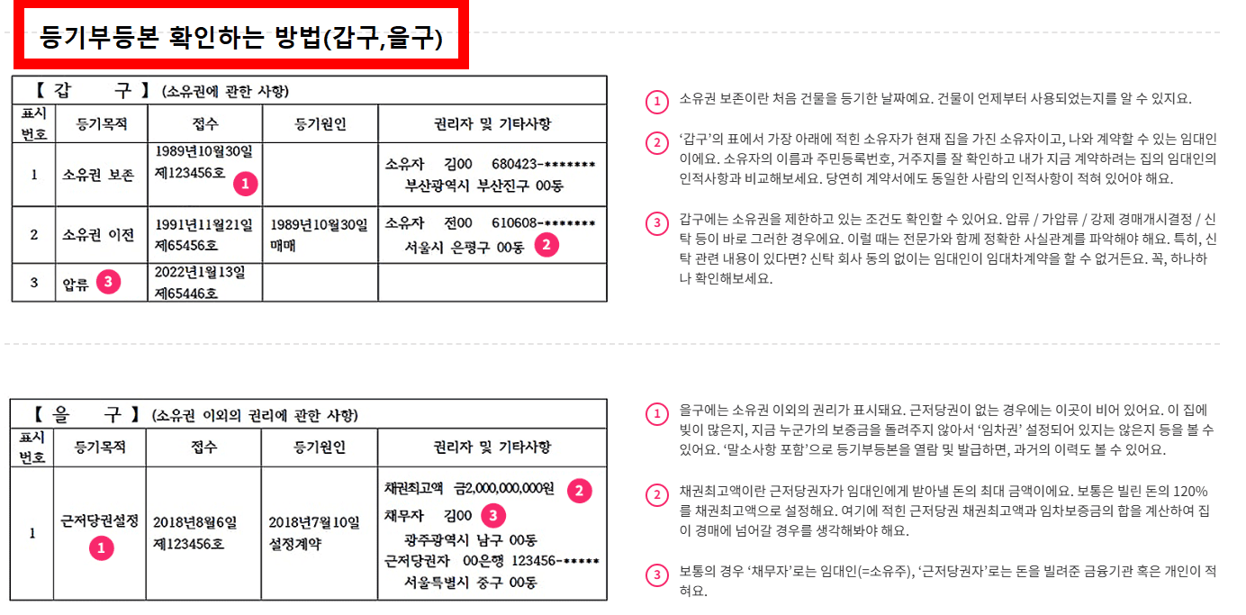 등기부등본 확인 | 집주인 실소유주, 근저당·가압류 등 채권 확인. 갑구(소유권), 을구(채권) 모두 체크 |